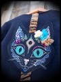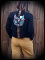 • Large embroidered patch on the back with multicolored cat head and muslin flowers, and fleece detail.