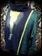 • Made from very fluid, slightly shiny turquoise blue marl knit fabric with navy center panel and cowl neck and Chartreuse green details.