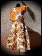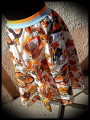 • Made from a vintage tablecloth with an orange and khaki floral pattern and lined with opaque white scuba fabric.