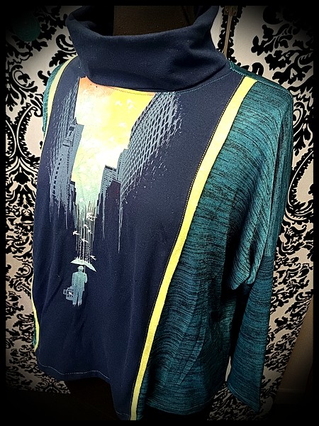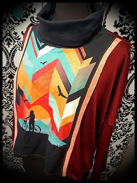 • Made from very fluid, slightly shiny dark red knit fabric with black center panel and cowl neck and marbled coral details.