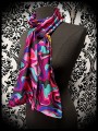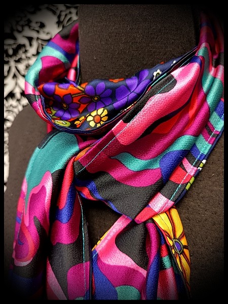 • Made of hot pink, purple, green, red, black satin fabric with a swirl pattern, and lined with midnight blue satin fabric with a multicolored floral print.
