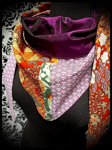 • Made of red, marroon and ochre fabric with Asian inspired print and plum Seigaiha printed fabric and lined with plum satin fabric.
