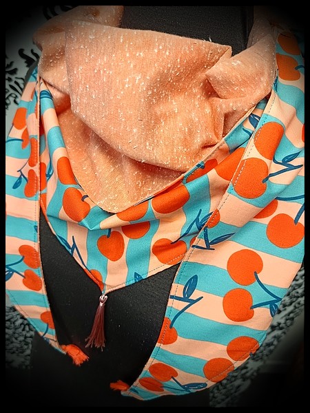 • Made of turquoise blue and peach-colored striped cotton fabric with cherries all over and lined with coral mottled knit fabric.
