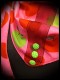 • Dark red decorative ribbon in the center with neon green dotted buttons.