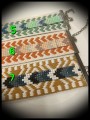 • Made from straps in various patterns and colors and rhinestone ribbon with a chevron pattern.