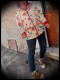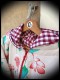 • Made from a quite thin quilted blanket with red flowers on a pale pink background and partially lined with dark red and white gingham fabric.