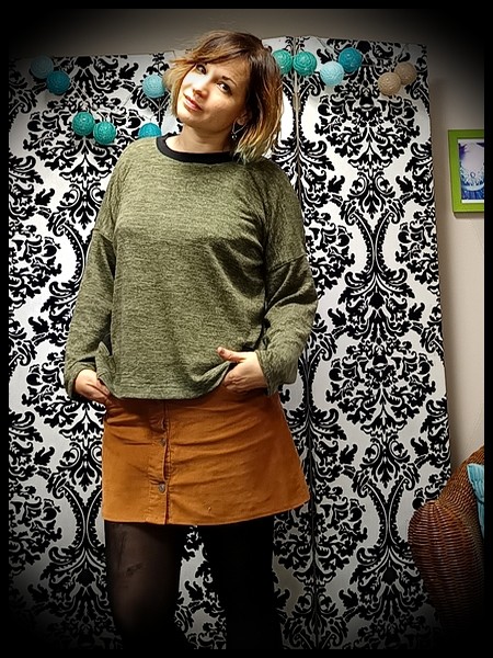 Confectionné à partir d'un pantalon homme bleu marine chiné. Ceinture élastiquée noire avec passants et ceinture à nouer. Boutons désassortis dans les tons noirs sur les poches aux fesses.