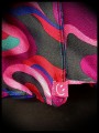 Ce foulard en tube a été confectionné à partir de tissu imprimé et de satin rose vif doux et brillant pour la doublure. Détail en ruban coloré avec boutons décoratifs assortis.