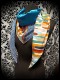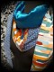 • Confectionné en tissu multicolore motif traits de peinture et tissu bleu roi motif Seigaiha et doublé en satin bleu turquoise.