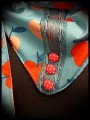 • Ruban décoratif bleu pétrole au centre et petits boutons rose vif à pois blancs.