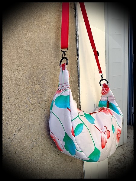 • Confectionné à partir d'une couverture matelassée assez fine à fleurs rouges sur fond rose pâle et doublée en tissu tie & dye rouille.