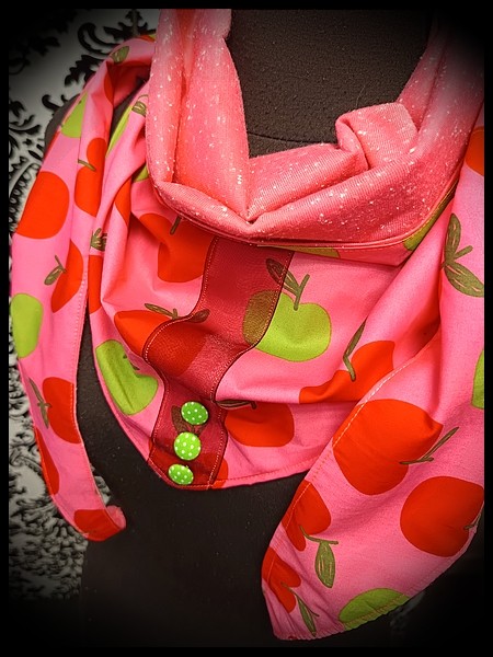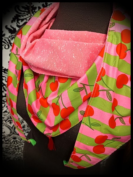 • Confectionné en coton vert pomme / rose bonbon avec imprimé pommes et cerises et doublé en jersey rose chiné.
