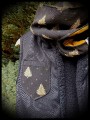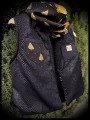 • Confectionné en tissu jacquard noir à sapins dorés et doublé en polaire jaune à traits dorés.